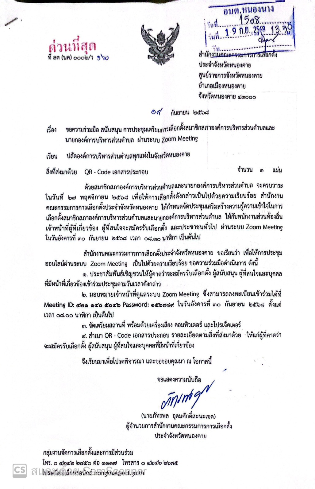 ประชาสัมพันธ์ เชิญชวนให้ผู้คาดว่าจะสมัครรับเลือกตั้ง/ผู้สนับสนุน/ผู้ที่สนใจร่วมรับฟังการประชุมการเตรียมการเลือกตั้งสมาชิกสภาองค์การบริหารส่วนตำบล ผ่านระบบ Zoom Meeting